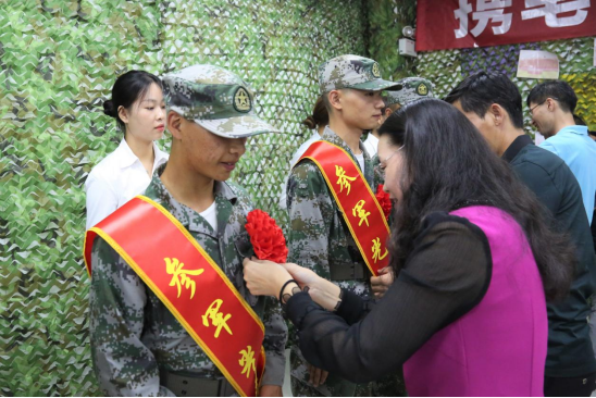 图六 杨虹副院长为入伍新兵佩戴光荣花