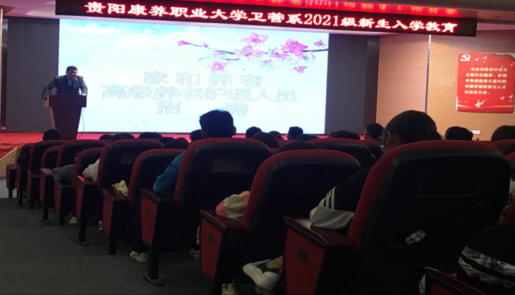 2021年10月12日-14日,贵阳365游戏盒子_beat365官方入口素描网_完美365体育app下载安装职业大学在学术报告厅开展“家和养老高级养老护理人员招聘”讲座,大连市家和养老中心宋毅总经理现场进行宣讲,2021级卫生管理系与护理系的学生参与讲座。
